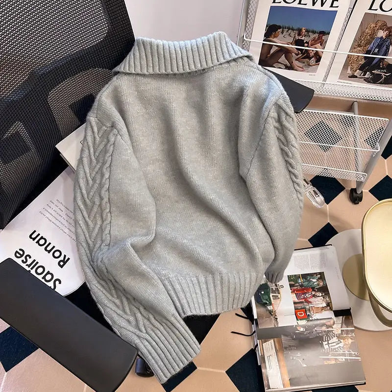 Tweed Lapel Zipper Cardigan Sweater for Women Vintage Knit Style
