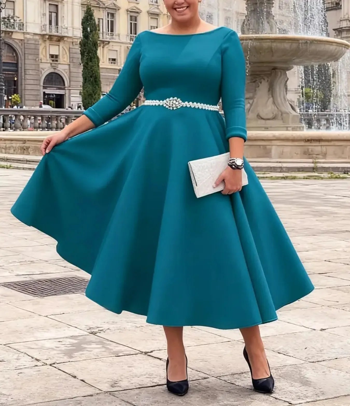 - Rhinestone belt accents at the waist and a boat collar add tasteful shine and neckline definition without overpowering your look.