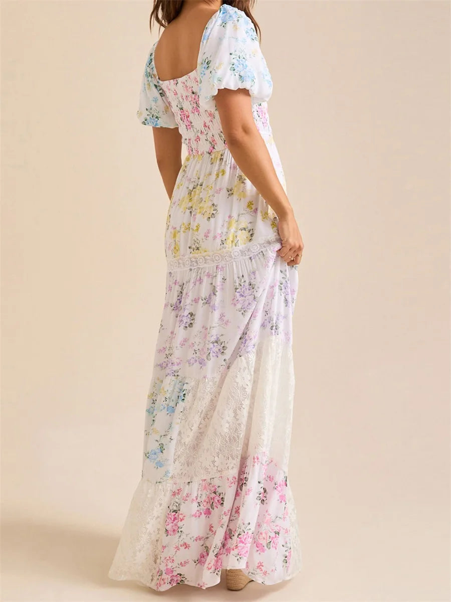 Elegant Floral Print Short Sleeve A-Line Dress with Ruffled Hem for Women