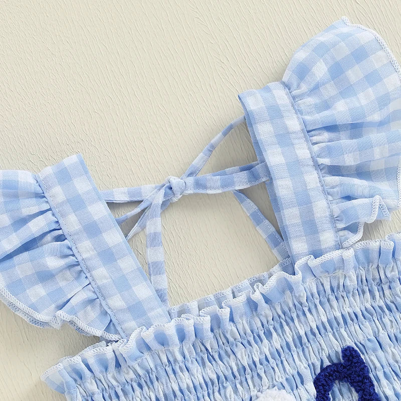 Independence Day Plaid Dress with Embroidered Stars and Stripes Smocked Flying Sleeve