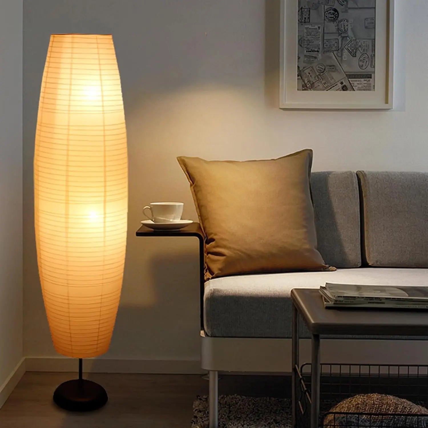Elevate your living space with a modern rice-paper floor lamp that casts a warm, inviting glow and architectural flair.
