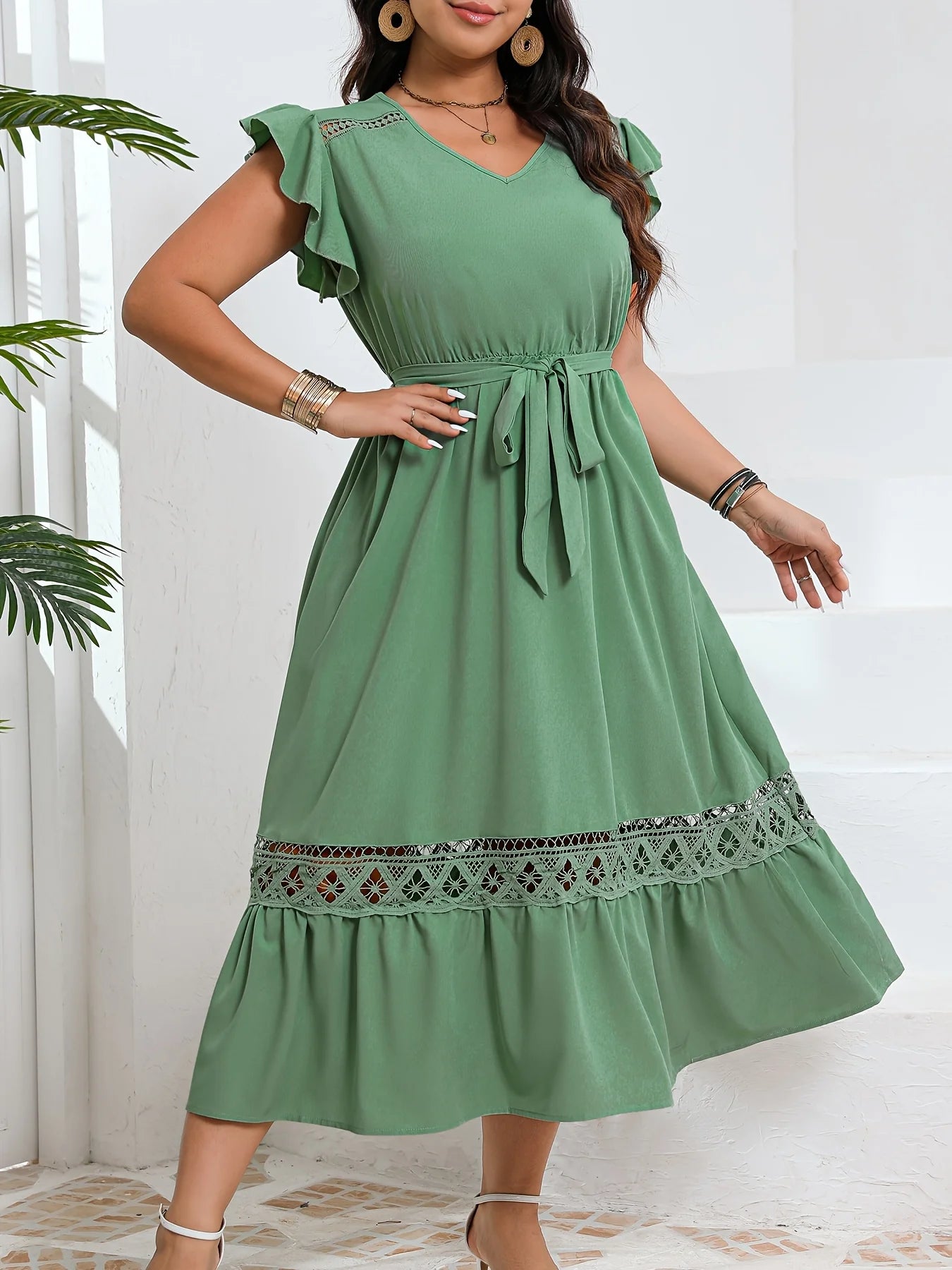 Plus Size Elegant Floral Print Midi Dress For Women - V-Neck Ruffled Sleeves With Belt