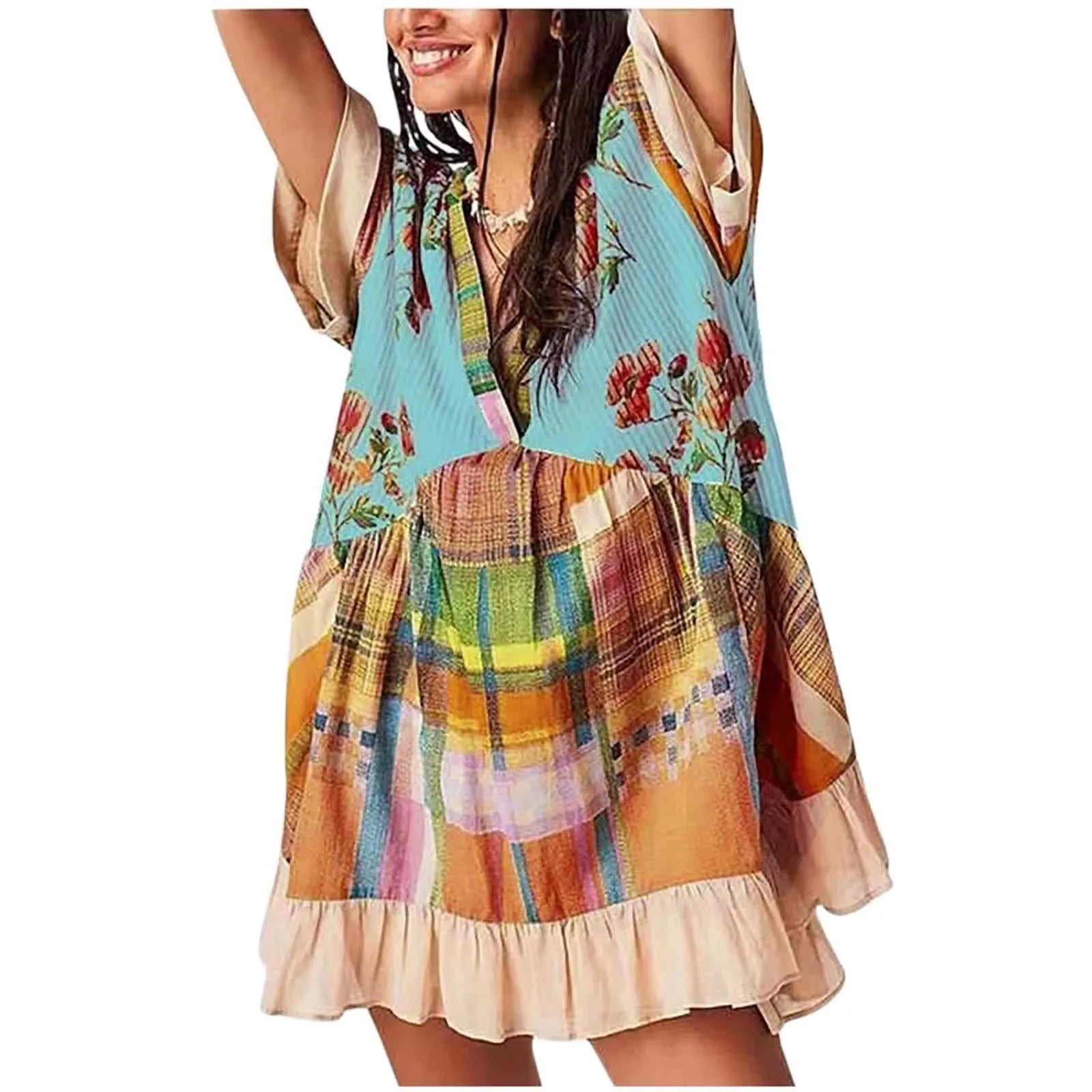 Women Boho Beach Mini Dress 2024 Summer V Neck Short Sleeve