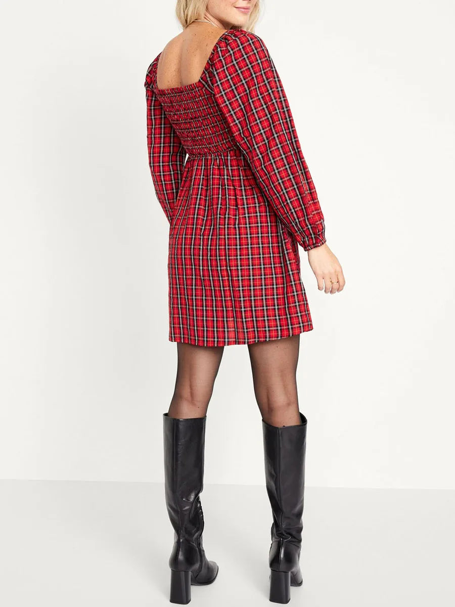 Women s Plaid Print A-line Dress Retro Long Sleeve U-Neck Mini Dress