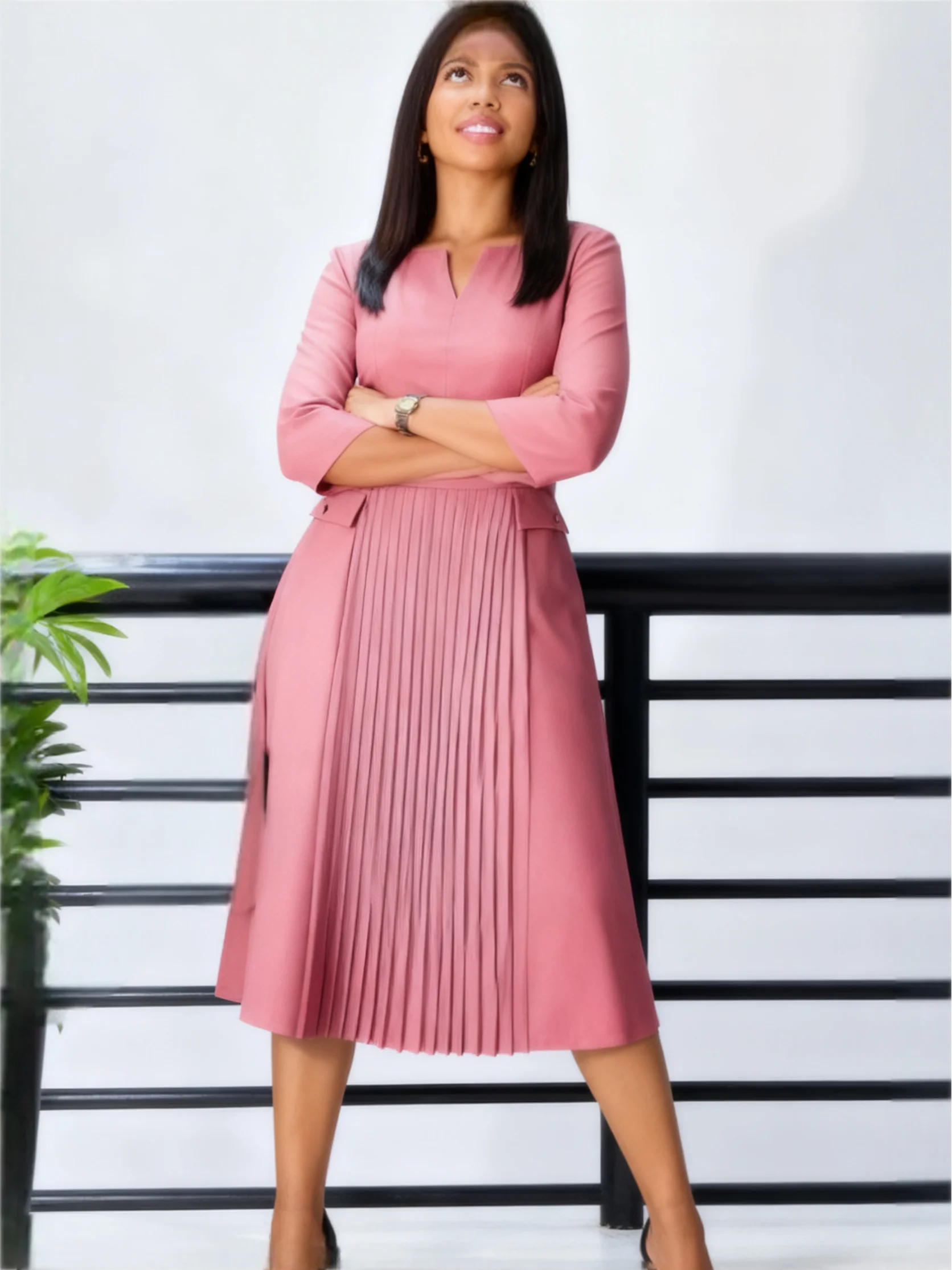 Women's Elegant A-Line Midi Dress - 34 Sleeve Small V-Neck Church Wedding