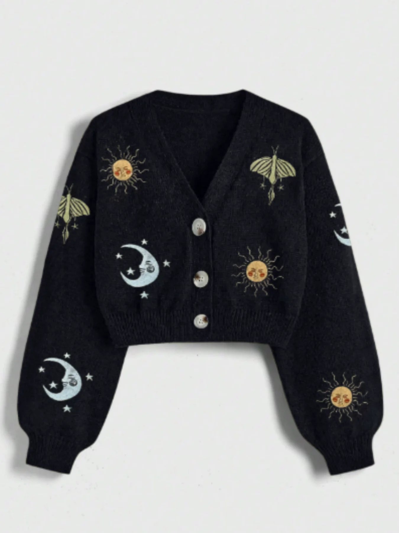 Womens Knitted Cardigan With Embroidered Pattern And Lantern Sleeves